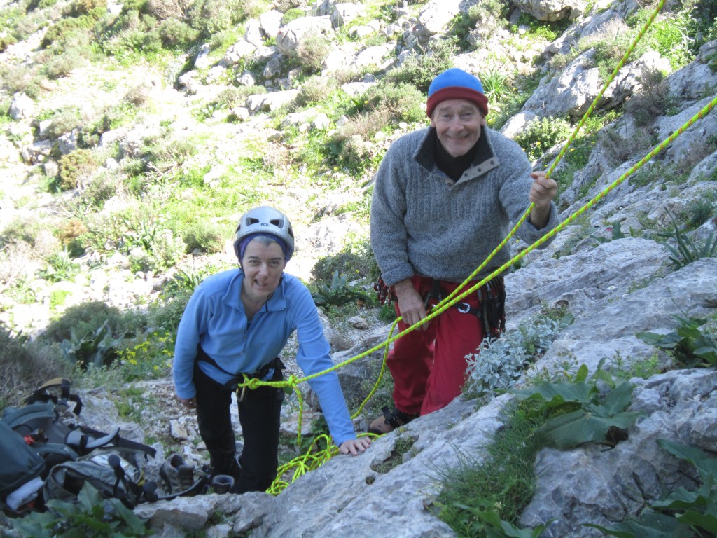 Arriving off the ferry from Kos, we were swept up by Jon and Gaynor’s enthusiasm and were on a crag by the afternoon. I made a rather shaky start but it did remind me just how much more enjoyable it is to climb outside. Of the nine days we spent on Kalymnos we climbed on seven. Each time we went to a different place and each place offered a range of grades so that we could all climb at the same location. Mark enjoyed the climbing so much that he didn’t find it a hardship to lead the easier routes for me to second. The crags were so spectacular that I was quite happy to watch the others on the harder routes when I had worn myself out.